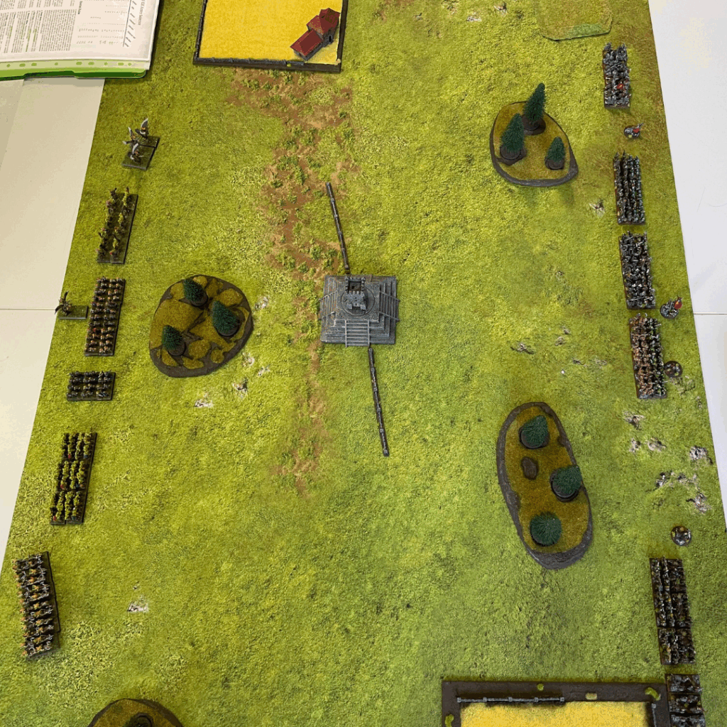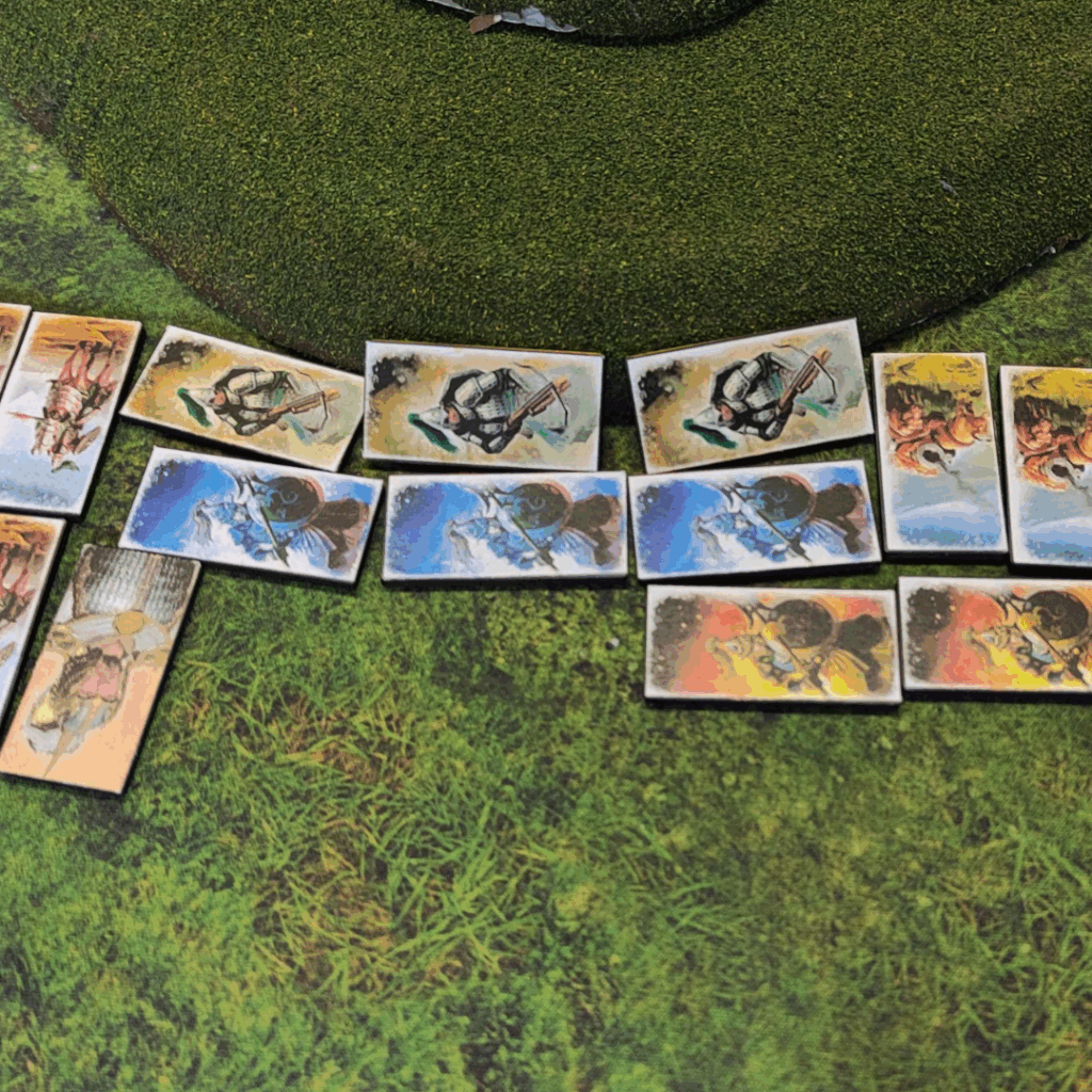 In der zweiten Schlacht hatten wir besonderen Besuch: einen Gastspieler aus Hannover mit seiner Reisearmee. Statt Miniaturen waren hier nur Symbolbilder auf den Baseplättchen. Eine clevere, platzsparende Lösung, die zeigt: Auch so sind spannende Spiele absolut möglich!